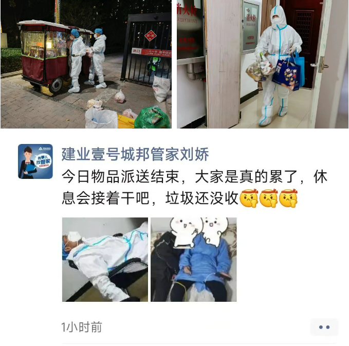 “咱們商量一下分工,趕緊行動起來!”“我們5個男的重點負(fù)責(zé)封控樓道的清收垃圾、防疫消殺、還有物資派送?!痹谶@次疫情防護(hù)中,5名維修工成為重要主力,承擔(dān)了物資配送等大部分體力勞動。